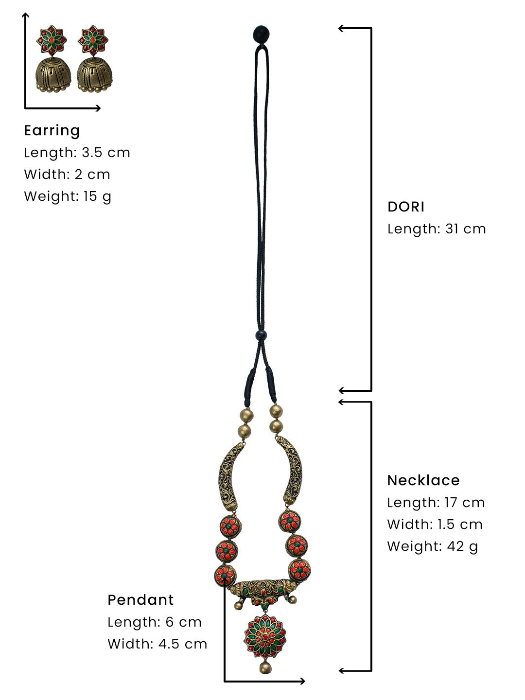 Varshika — Antique Gold Green Orange and Red Flower Design Handmade Terracotta Necklace Set