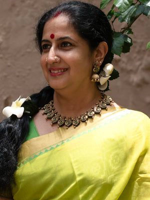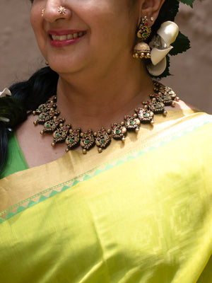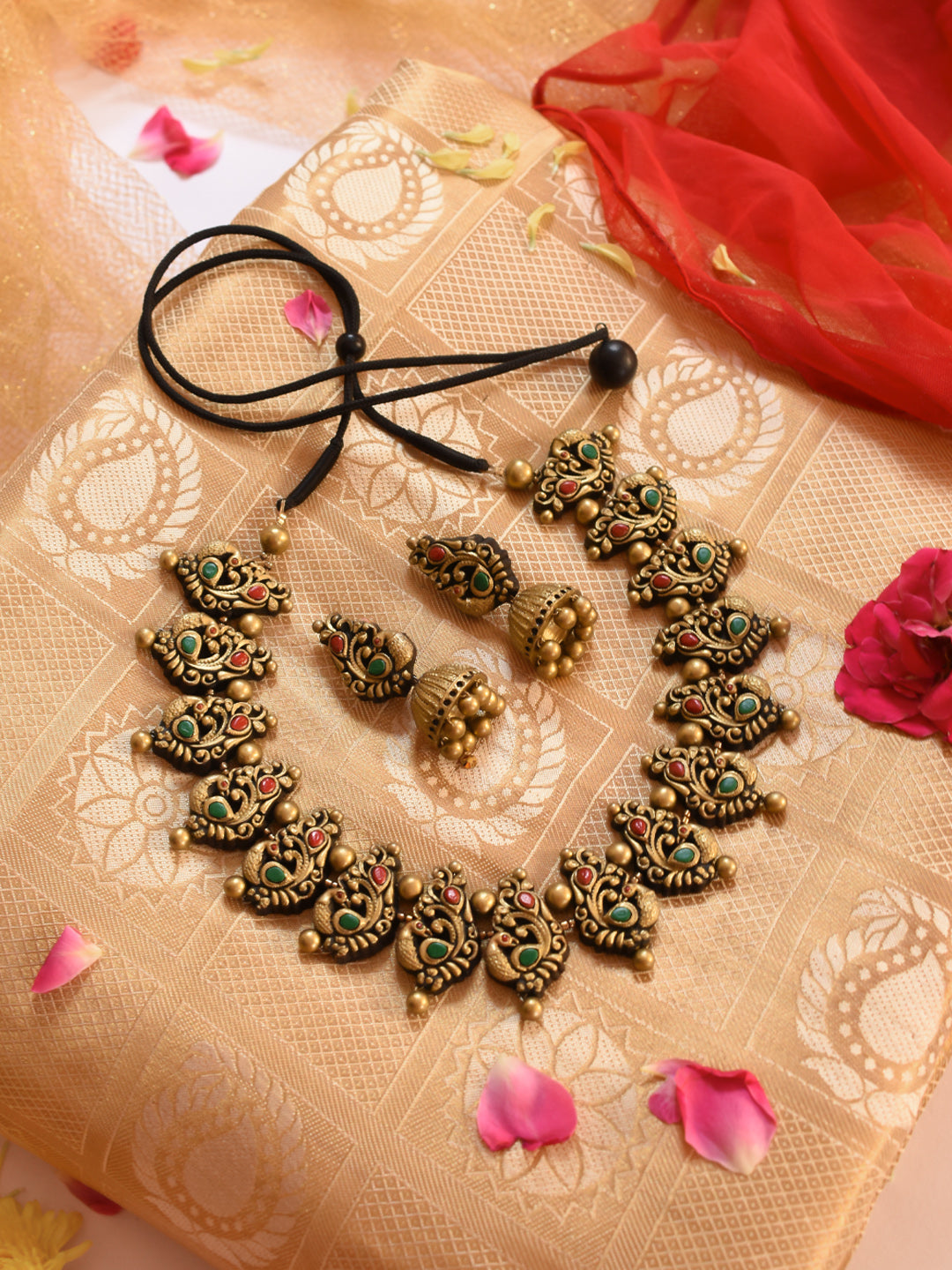 Antique Gold Green Red Dancing Peacock Handmade Terracotta Necklace Set