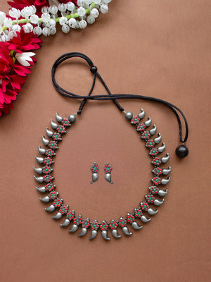 Silver Gold Green Red Flower Mango Design Handmade Terracotta Necklace Set