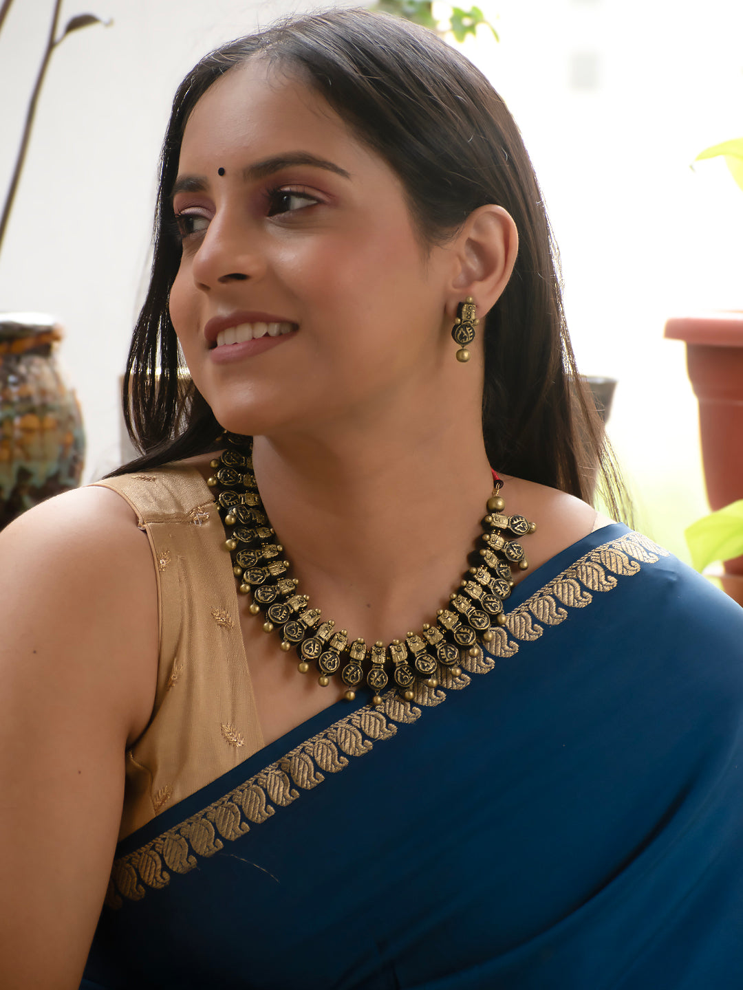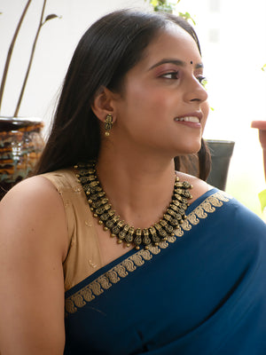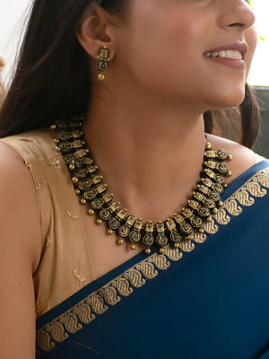 Antique Gold Peacock Engraved Circular Pattern Design Handmade Terracotta Necklace Set