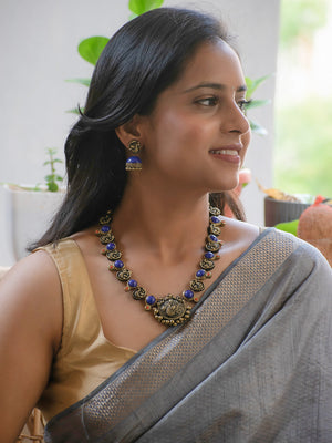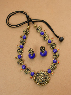Antique Gold Purple and Orange Peacock Design Handmade Terracotta Necklace Set