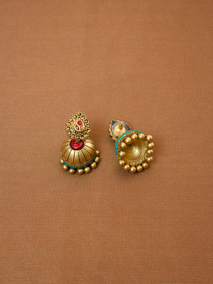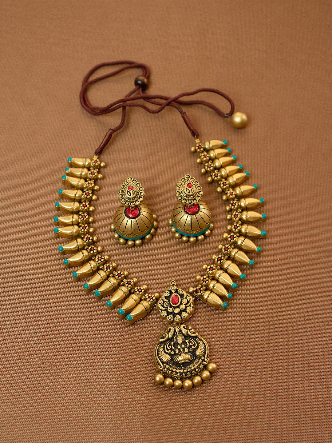 Antique Gold Red and Blue Lakshmi Design Handmade Terracotta Necklace Set