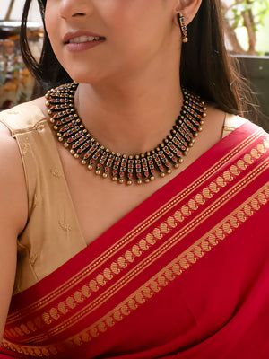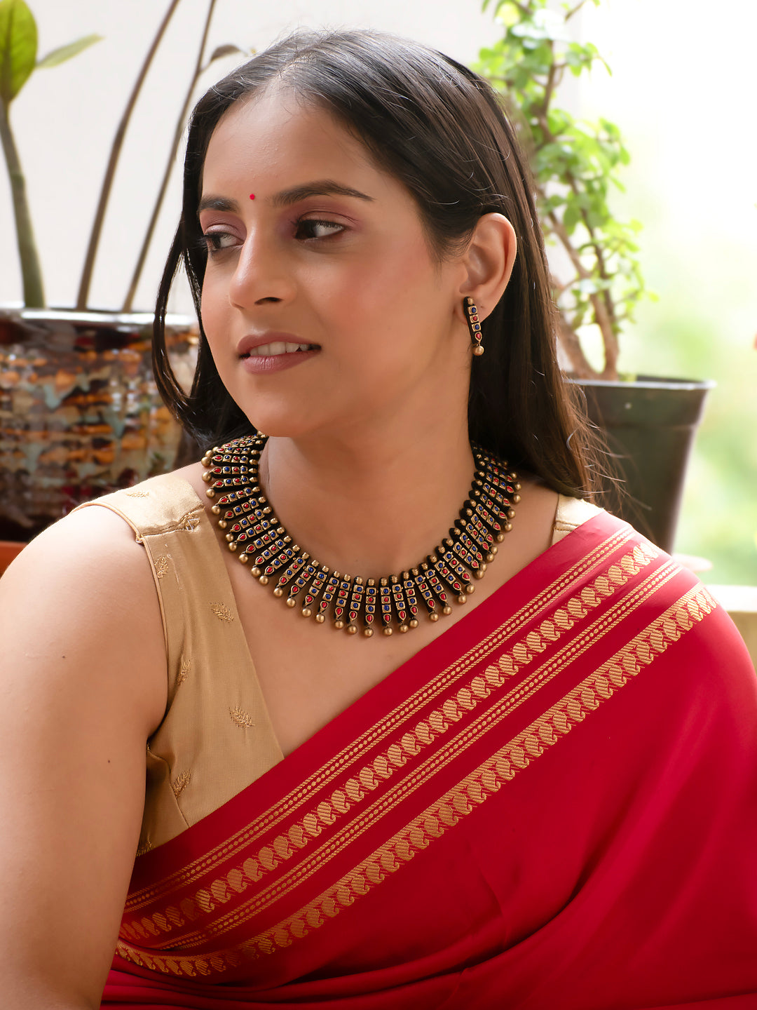 Antique Gold Red Blue Fringe Pattern Boho Handmade Terracotta Necklace Set