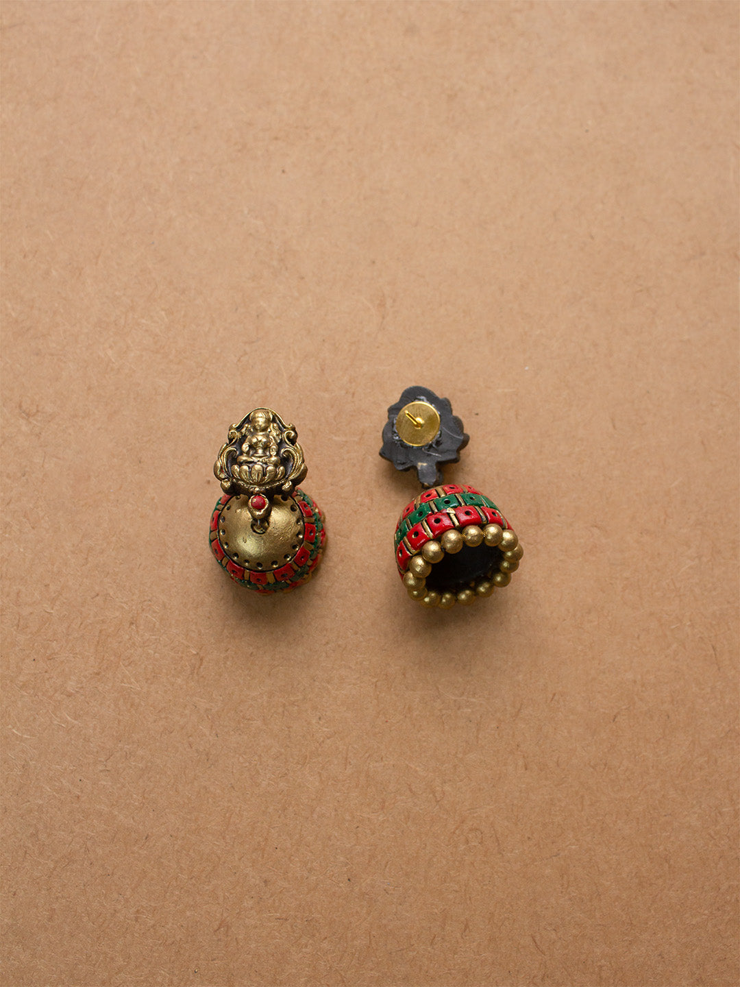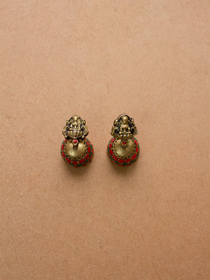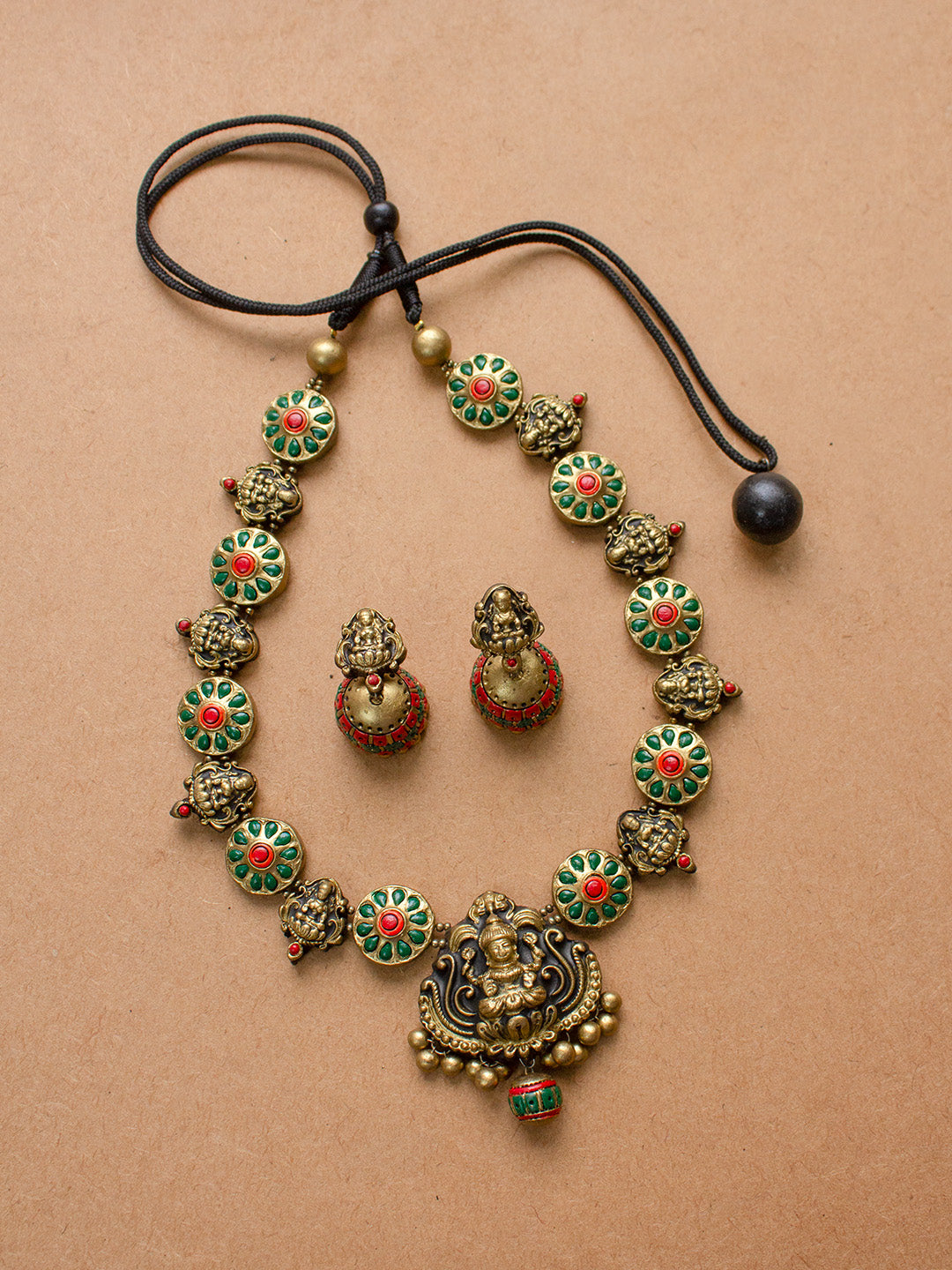 Antique Gold Red Green and Orange Lakshmi Design Handmade Terracotta Necklace Set