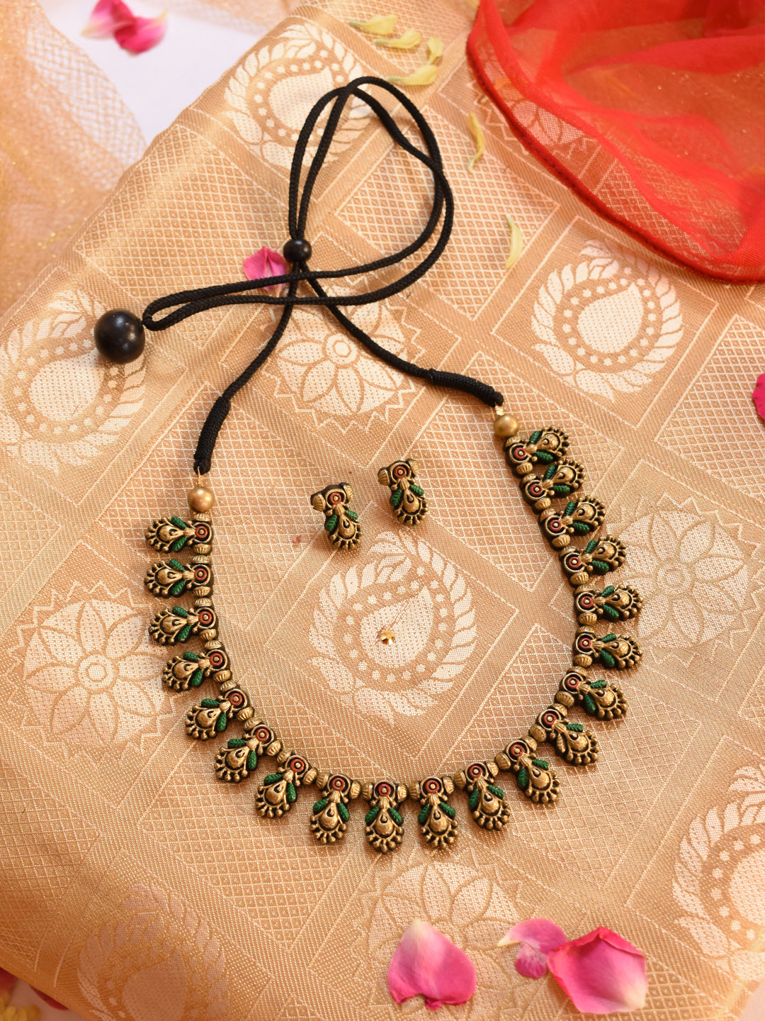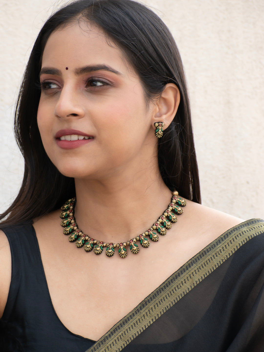 Antique Gold Red Green Leaf Element Fusion Handmade Terracotta Necklace Set