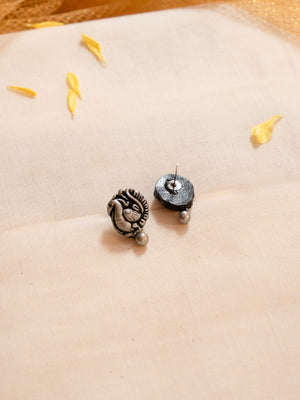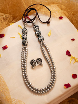 Antique Silver Two Layered Rani Haar Peacock Side Motifs Handmade Terracotta Necklace Set