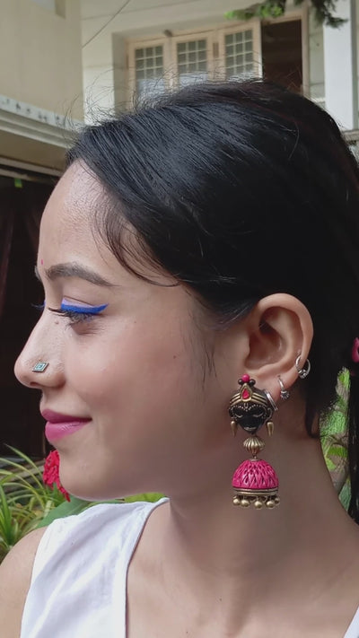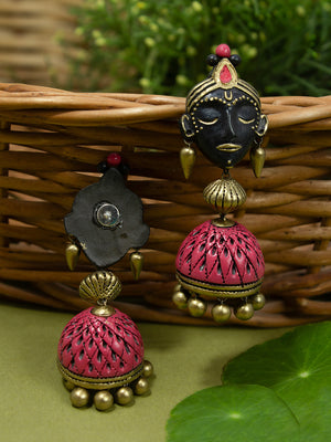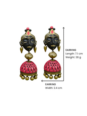 Krishna Face Handmade Terracotta Black Antique Gold Pink Jhumka Earrings