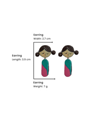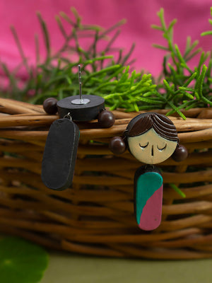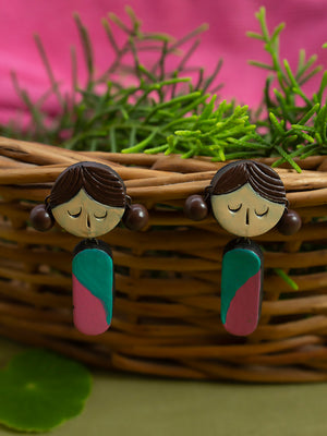 Little Girl Sleepy Face Design Pink Green Brown Handmade Terracotta Earrings