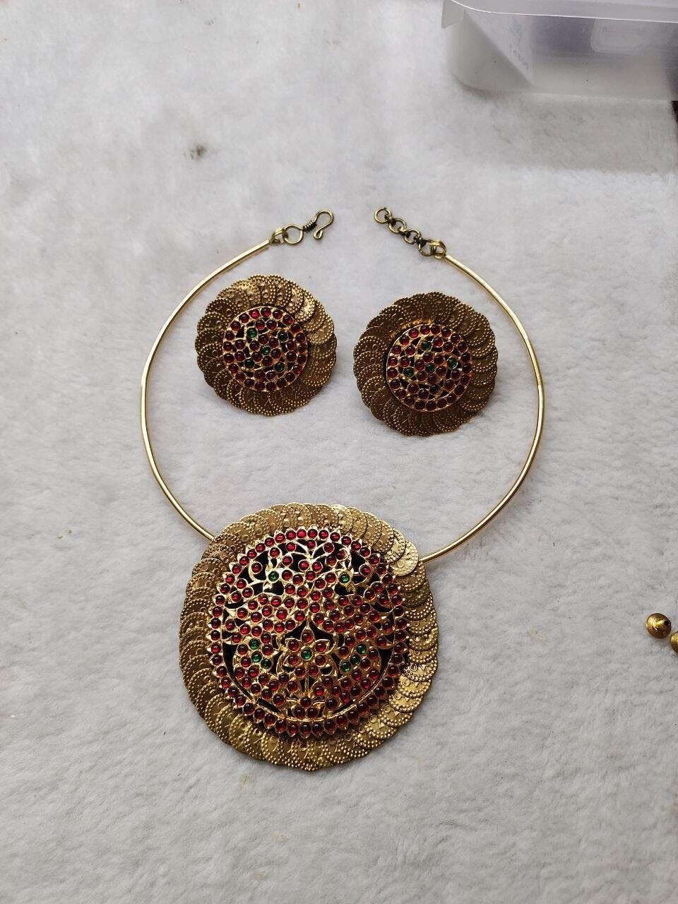 Gold Tone Temple Necklace Set- Coined Haslee Set Celebrity Styles