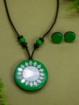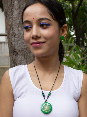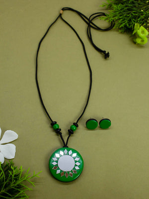 Green Circular Shape Mirror Design Work Minimalistic Handmade Terracotta Necklace Set
