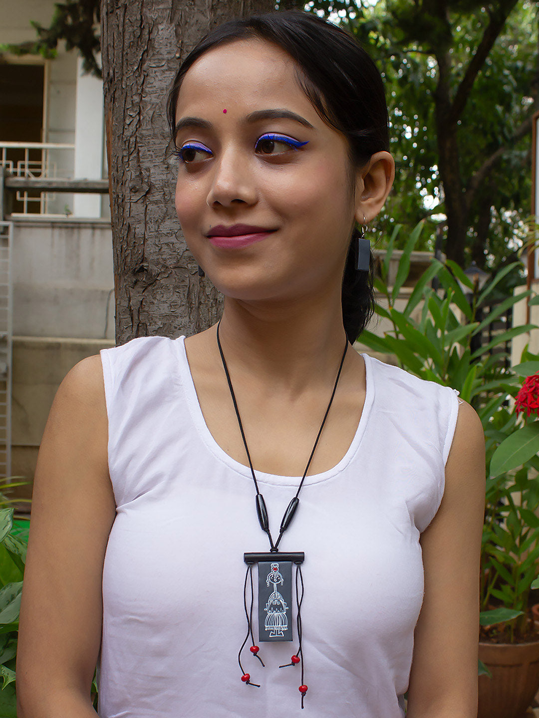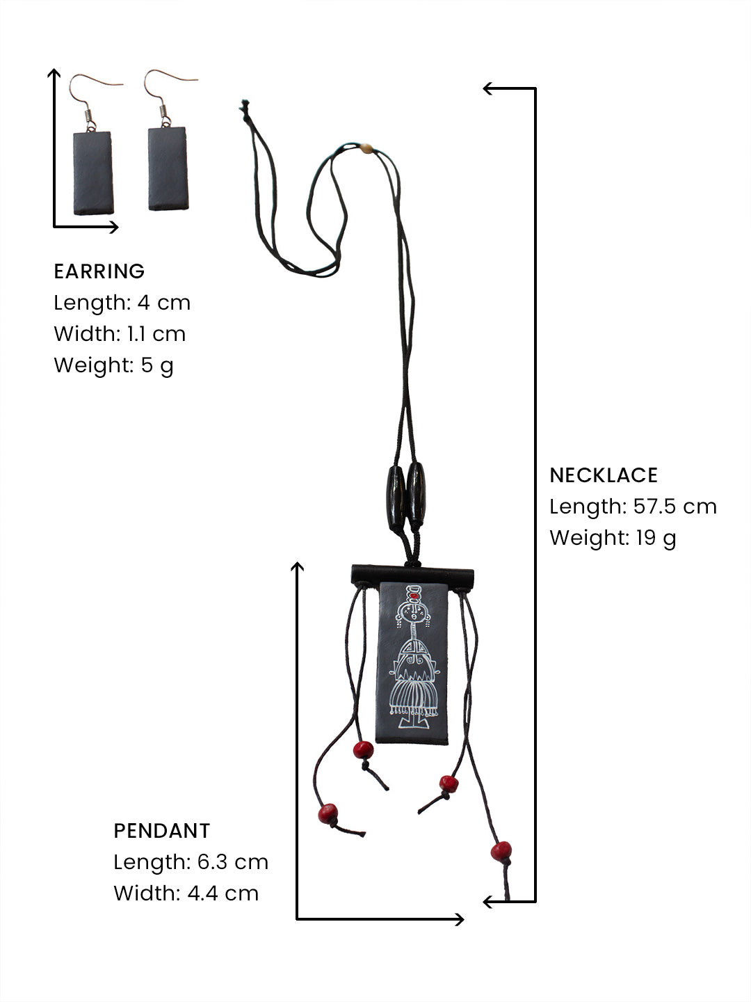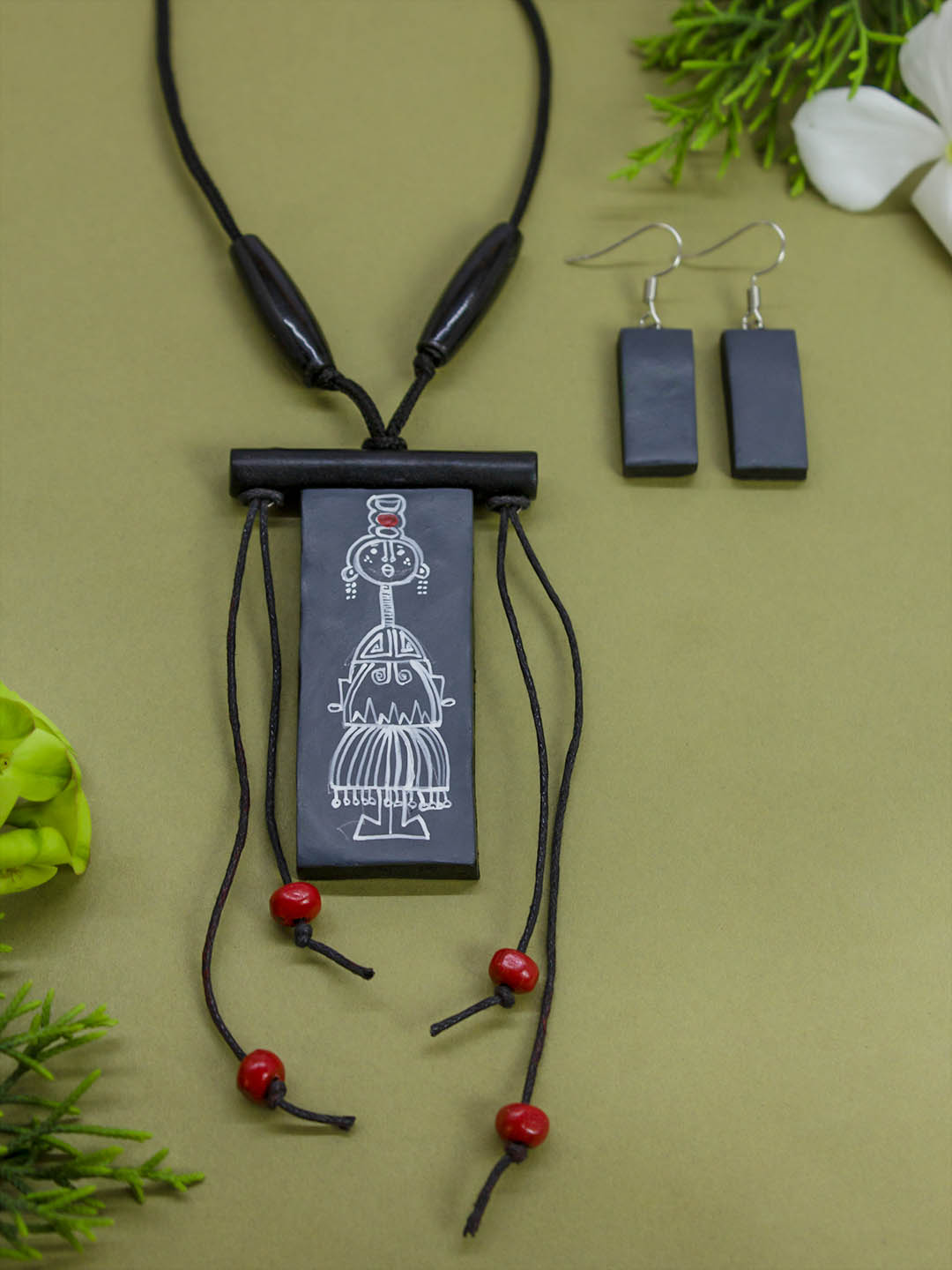 Grey White Rectangular Shape Folk Art Warli Art Painting Handmade Terracotta Necklace Set
