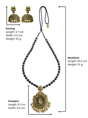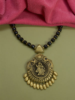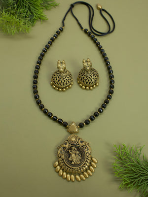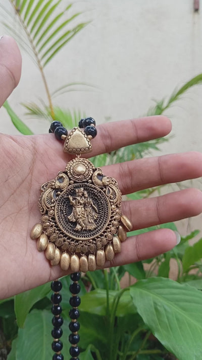 Radha Krishna Design Black Semi-precious Agate Beads and Antique Gold Handmade Terracotta Necklace Set