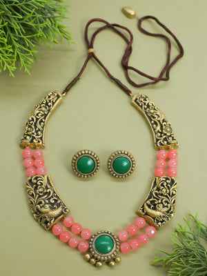 Chandralekha — 2 Layered Rani Haar Design Pink Glass Beads Peacock Design Antique Gold Green Handmade Terracotta Necklace Set