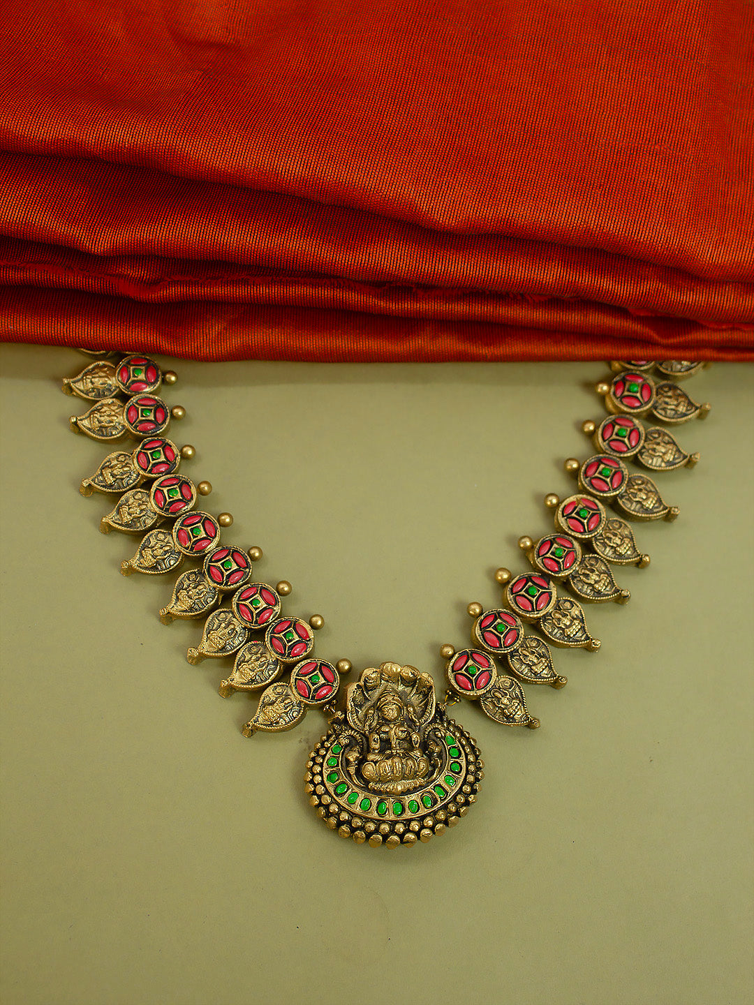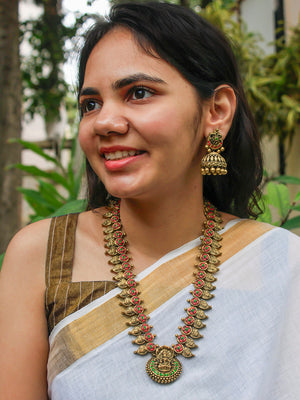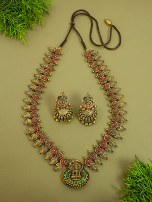 Antique Gold Pink Green Lakshmi and Mango Design Handmade Terracotta Necklace Set
