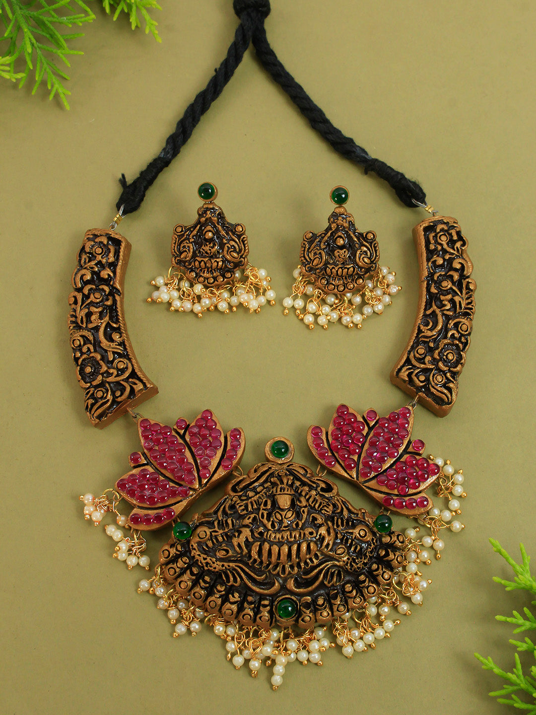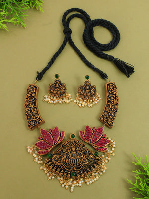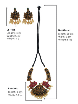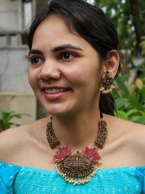 Lakshmi Peacock Design Filgree Work Gold Pink Green Handmade Terracotta Haram Necklace Set