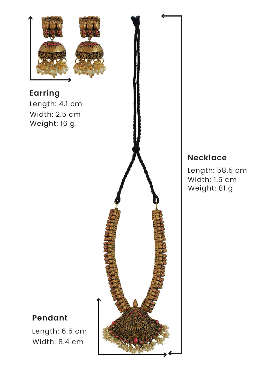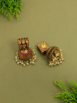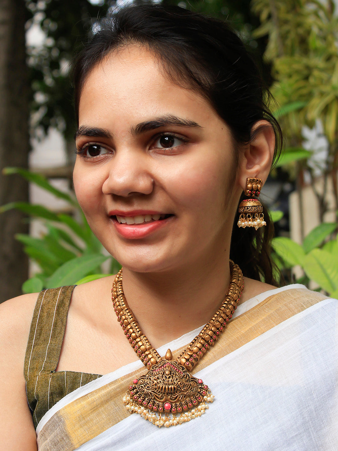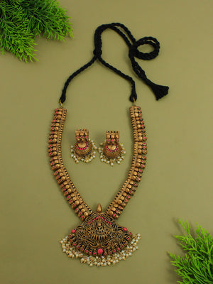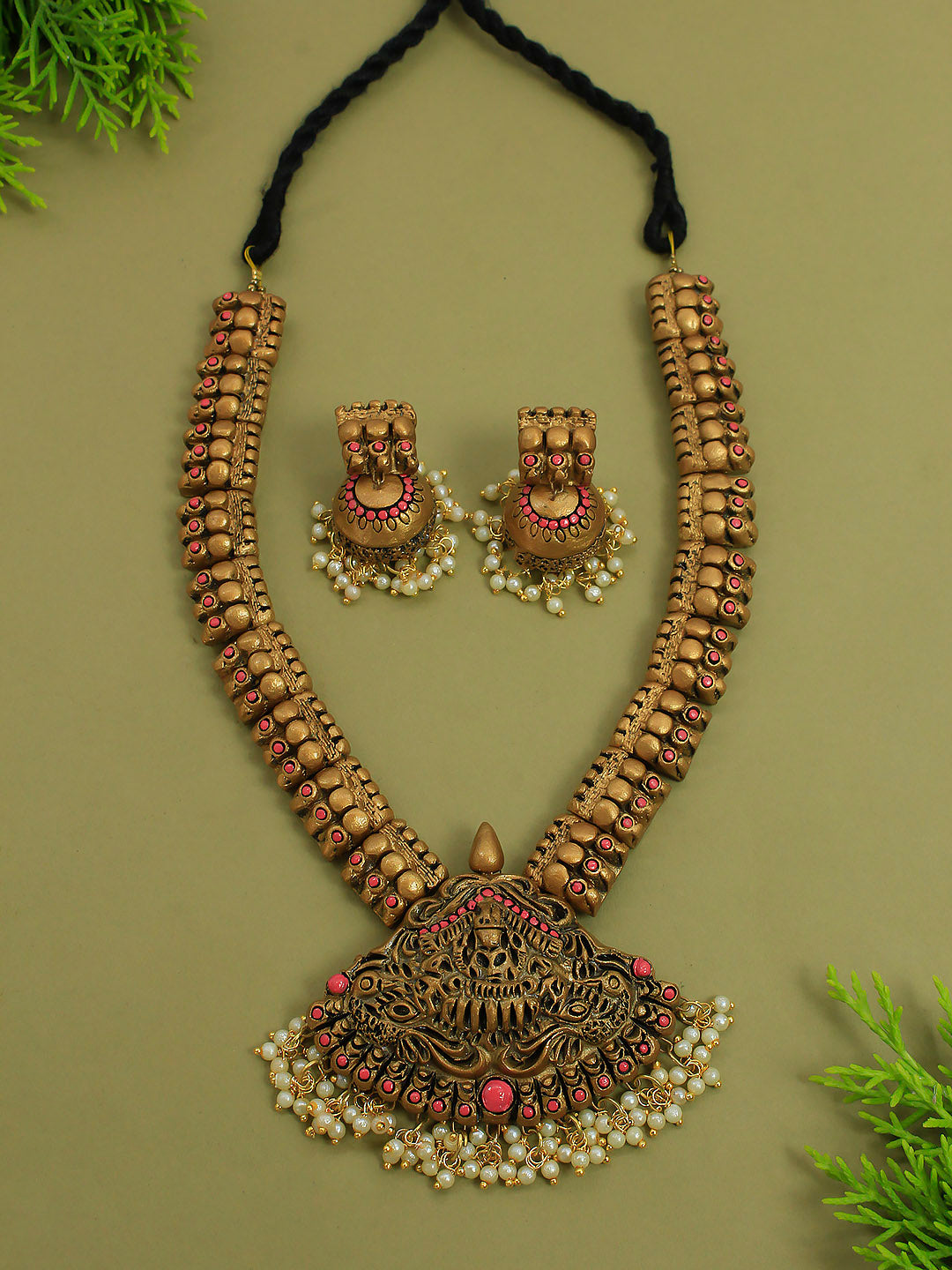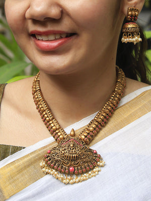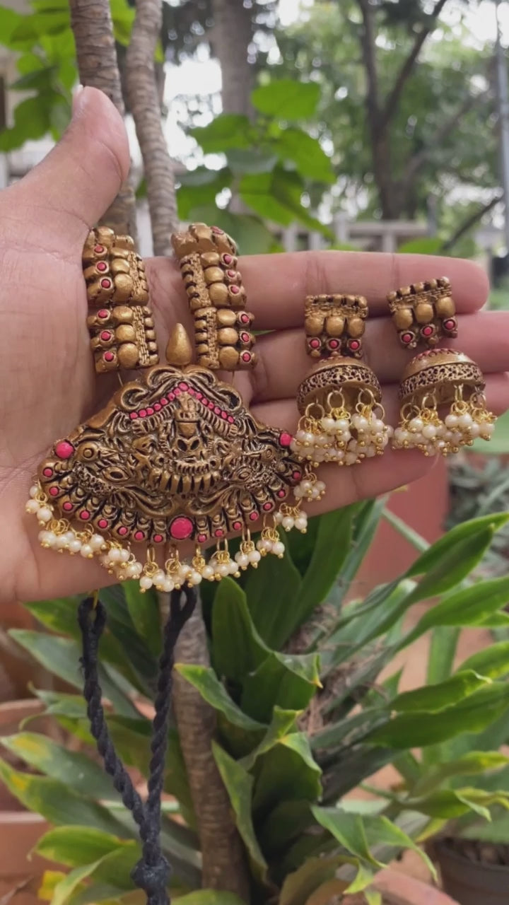 Lakshmi Durga Design Antique Gold Pink Short Length Handmade Terracotta Necklace Set