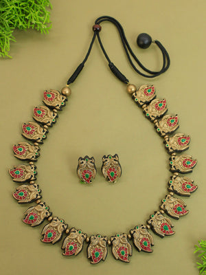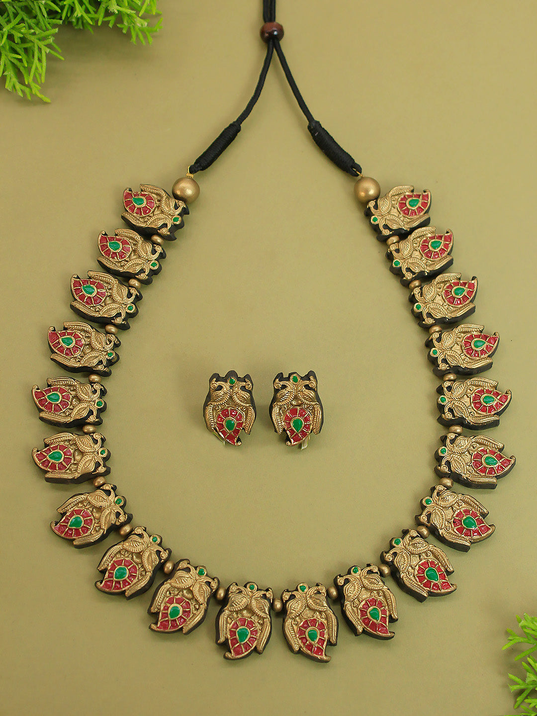 Mango Peacock Design Antique Gold Red Green Handmade Terracotta Necklace Set