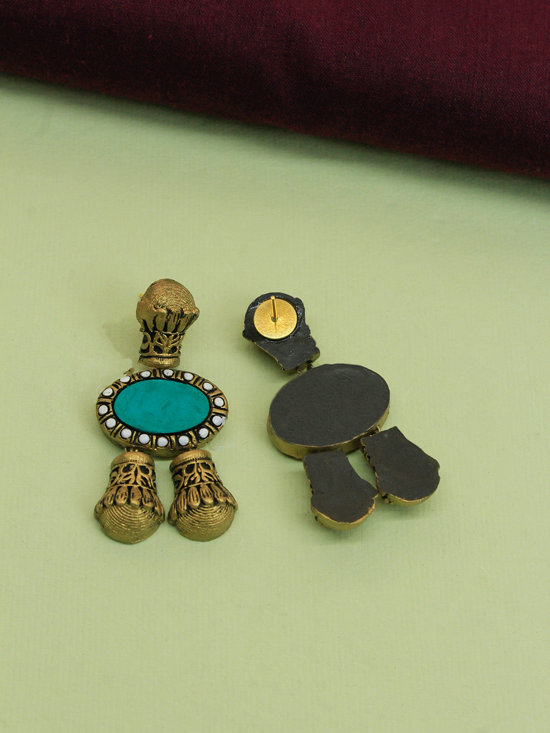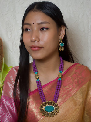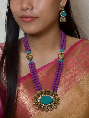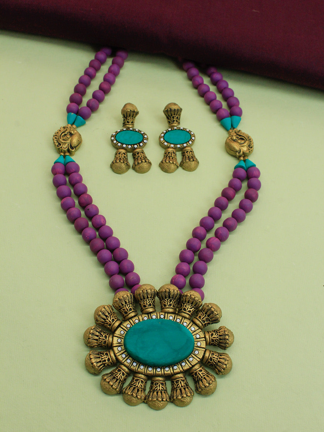 Home Antique Gold Purple Teal Long Haram 2 Layered Oval Pendant Handmade Terracotta Necklace Set