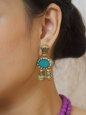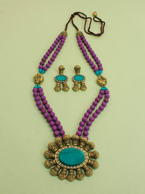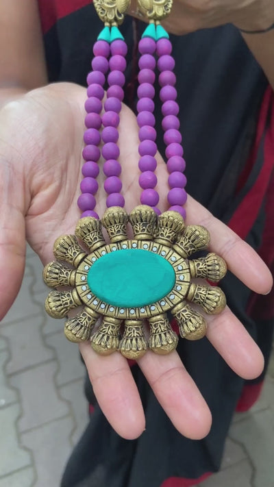 Antique Gold Purple Teal Long Haram 2 Layered Oval Pendant Handmade Terracotta Necklace Set