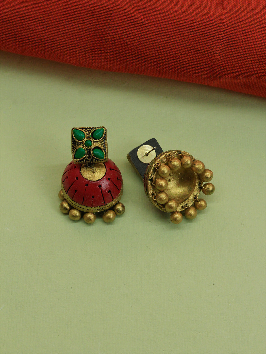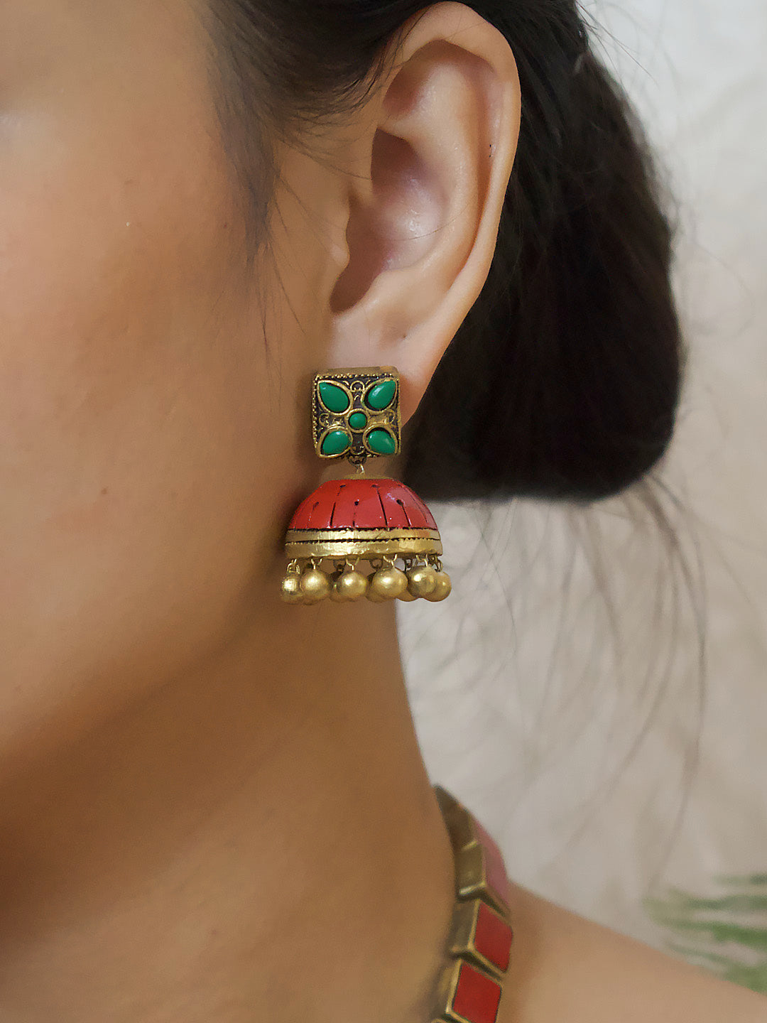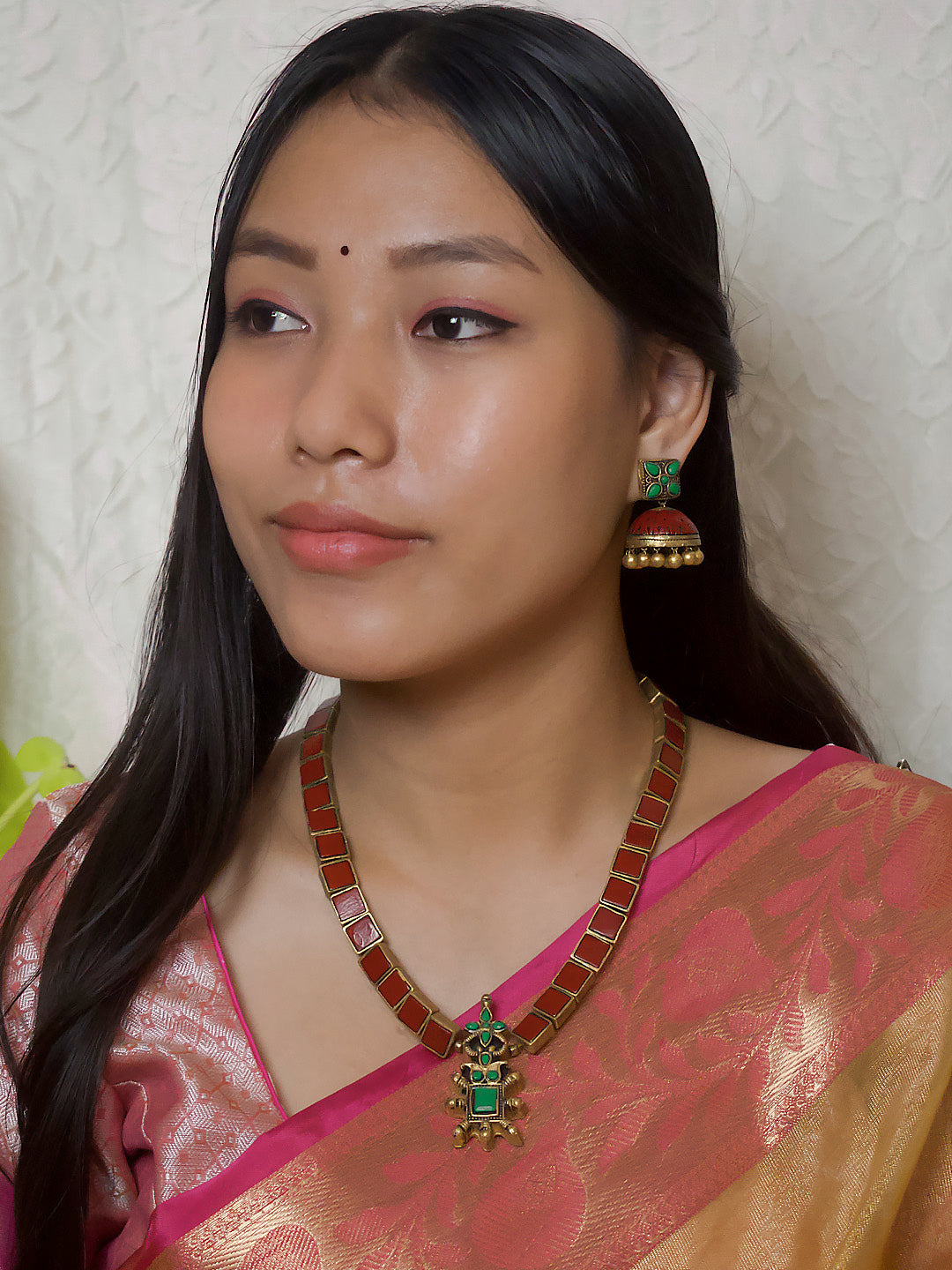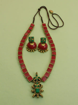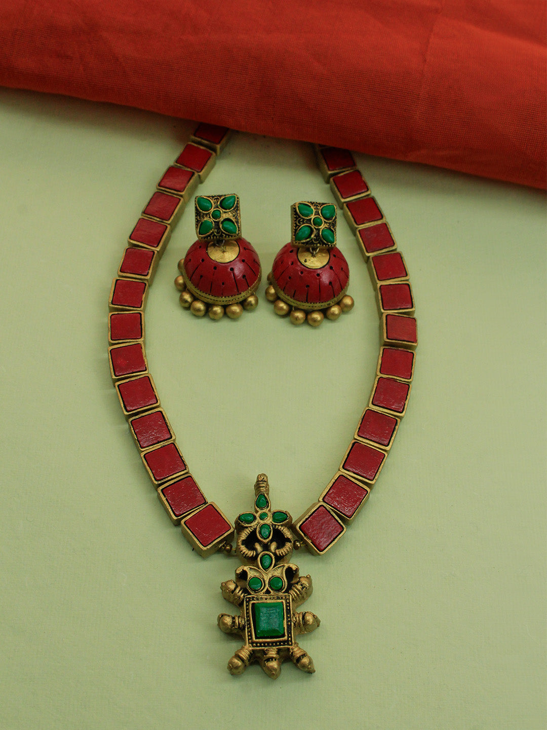 Antique Gold Dark Red Green Square Geometric Design Handmade Terracotta Necklace Set