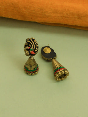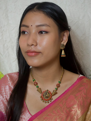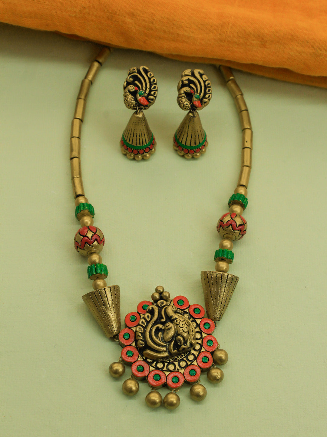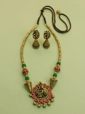 Antique Gold Red Green Peacock Design Handmade Terracotta Necklace Set