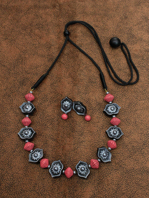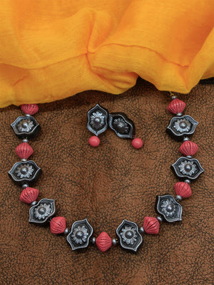 Home Antique Silver and Peach Colour Minimalistic Mandala Art Work Handmade Terracotta Choker Necklace Set