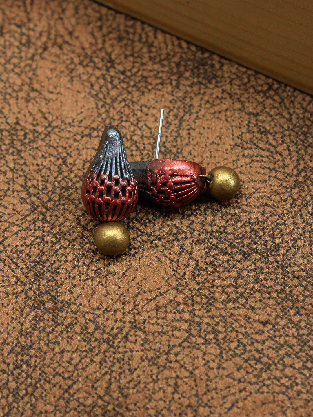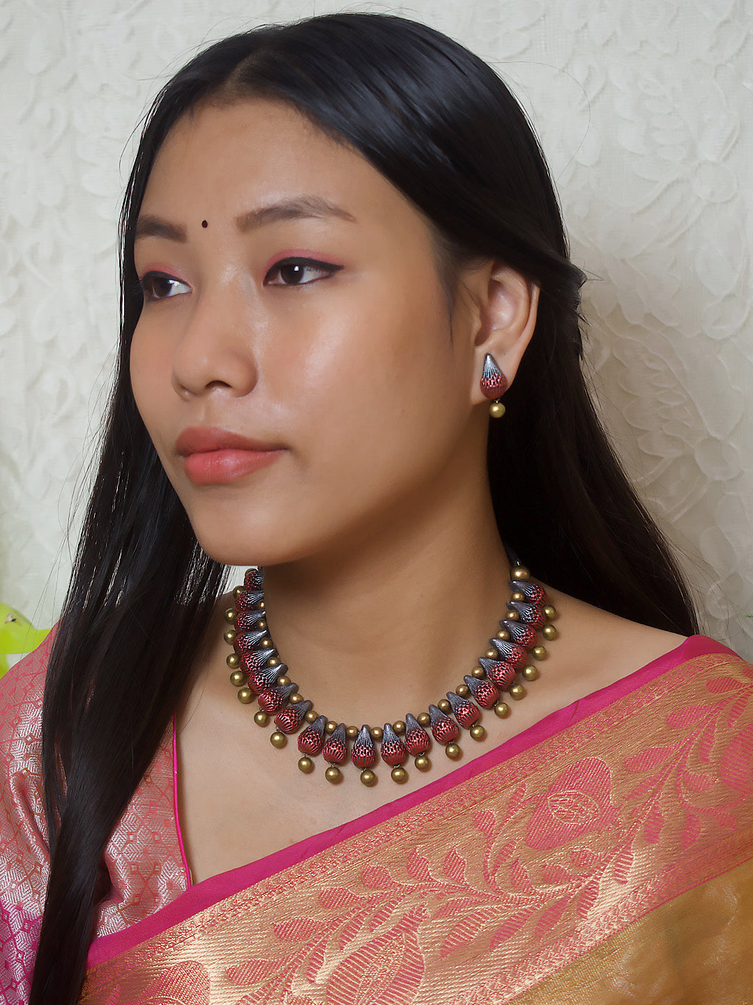 Copper Silver and Gold Ombre Dual Shade Pear Shape Pattern Handmade Terracotta Necklace Set