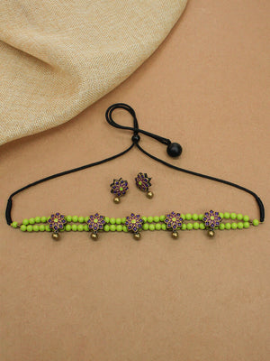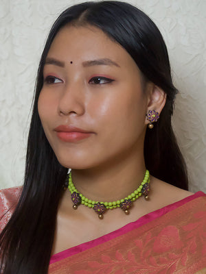 Bamboo Purple Antique Gold Green Pastel Shade Two Layered Choker Handmade Terracotta Necklace Set