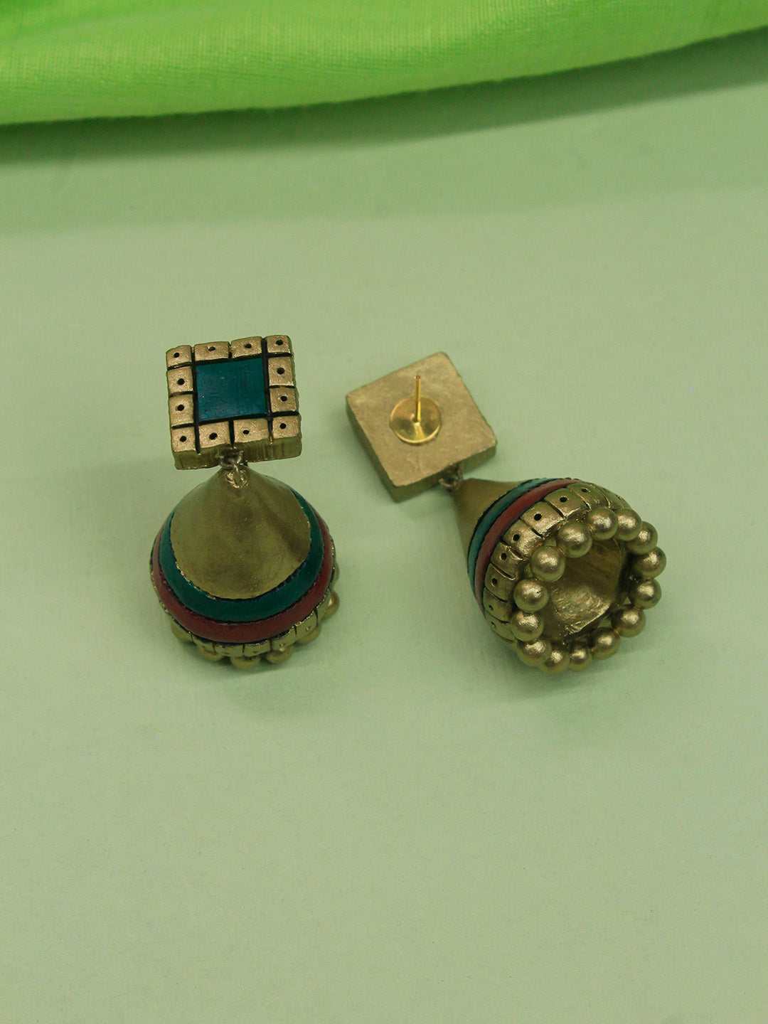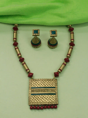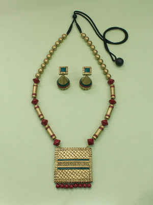 Home Mandala Art Square Design Maroon Antique Gold Dark Green Handmade Terracotta Long Necklace Set