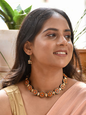 Home Beautifully Handcrafted Floral Terracotta Jewellery Set in Orange & Antique Bronze with Kundan Stones