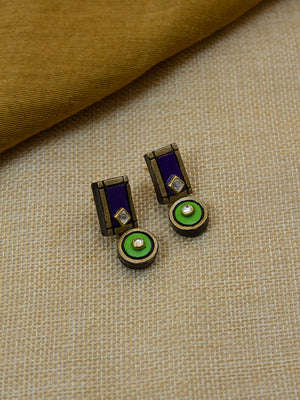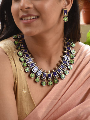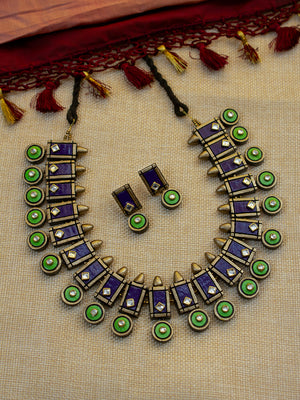 Beautifully Handcrafted Geometric Terracotta Jewellery Set in Violet, Green & Antique Bronze with Kundan Stones