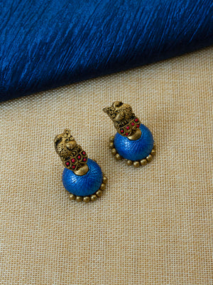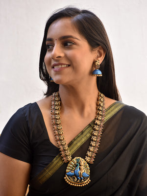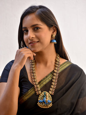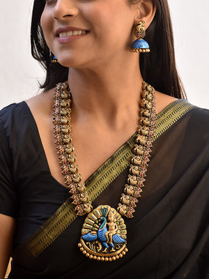Home Beautifully Handcrafted Lord Subramanya Peacock Design Terracotta Jewellery Set in Royal Blue & Antique Gold