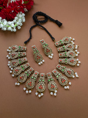 Home Beautifully Handmade Antique Bronze Terracotta Jewellery Set with Red, Green & Kundan Stones