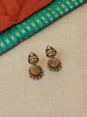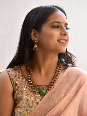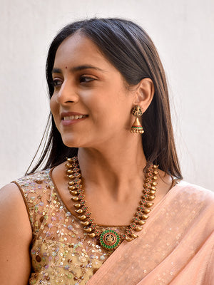 Beautifully Handmade Green & Red Lakshmi Pendant Terracotta Jewellery Set in Antique Gold