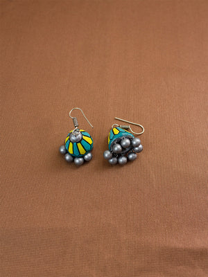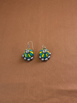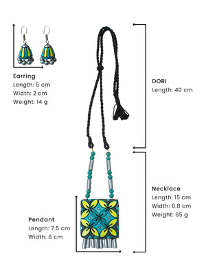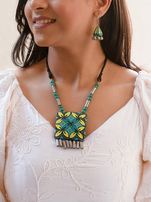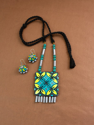 Blue Yellow and Silver Floral Design Handmade Terracotta Necklace Set