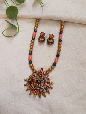 Bold Tribal Fan Terracotta Necklace Set in Red and Black Earrings