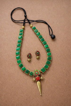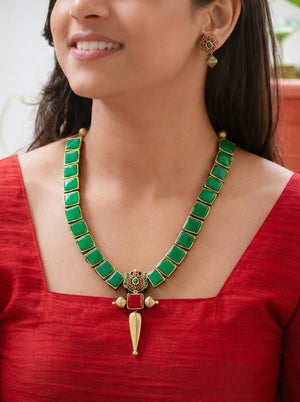 Charvika — Green Square Motifs Design with Red/Gold Pendant Handmade Terracotta Necklace Set