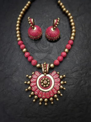 Handmade Circular Design Hand Painted Red Pink Finish Terracotta Jewelry Set