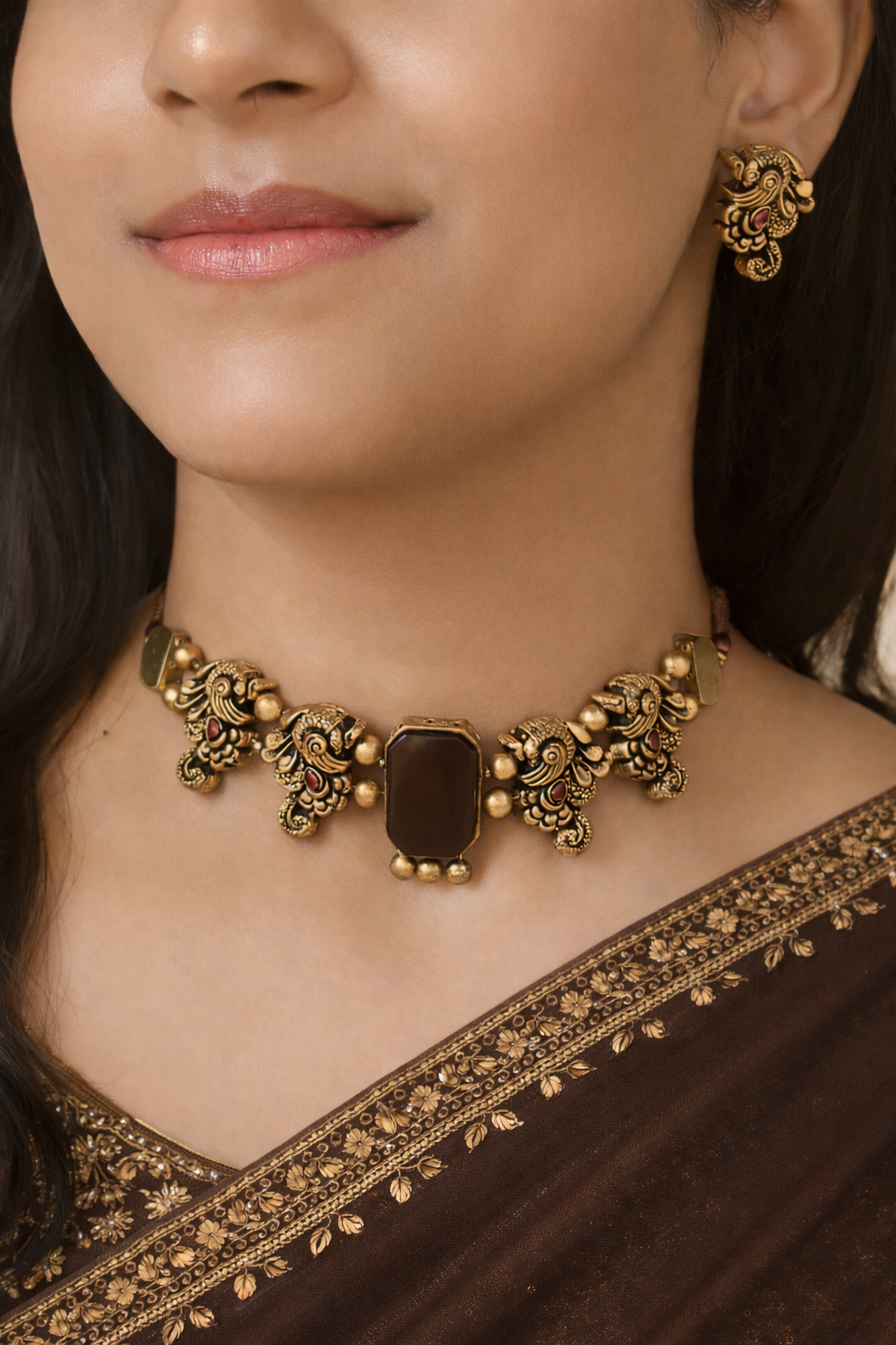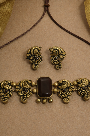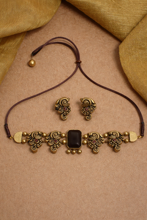 Coco Amala — Minimalistic Antique Gold Choco Brown Peacock Design Handmade Terracotta Victorian Choker Necklace Set