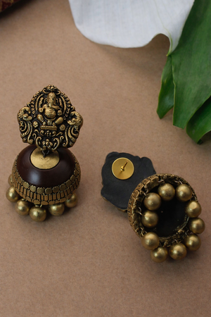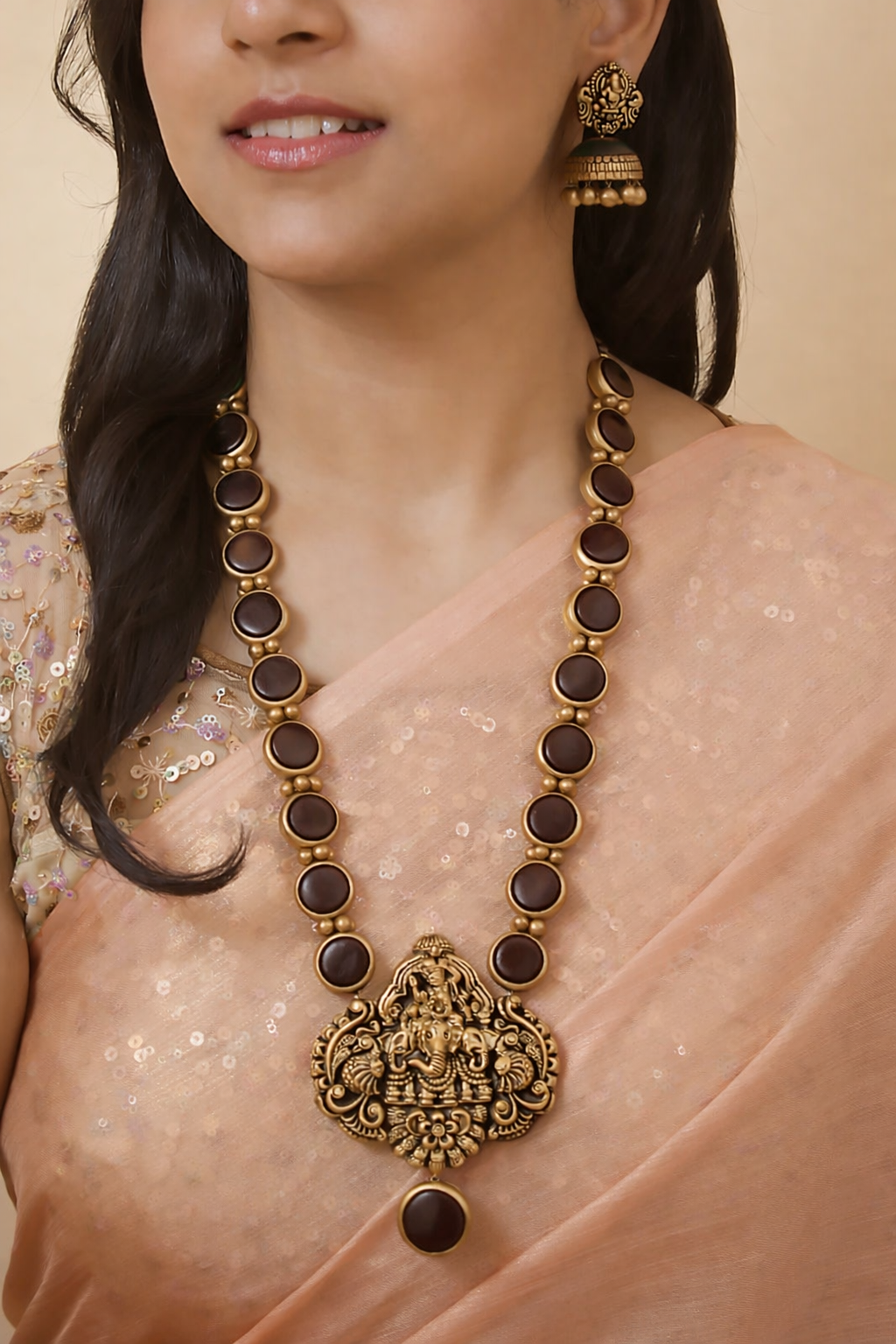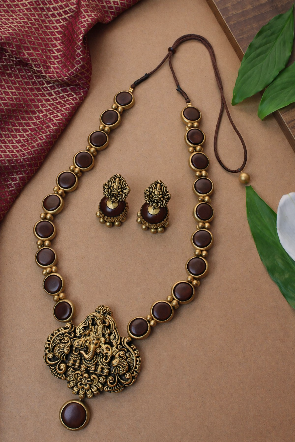 Cocoa Ganesha — Mocha Brown and Antique Gold Circular Pattern Ganesha Pendant Design Temple Long Handmade Terracotta Necklace Set