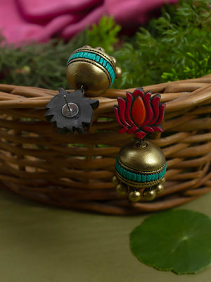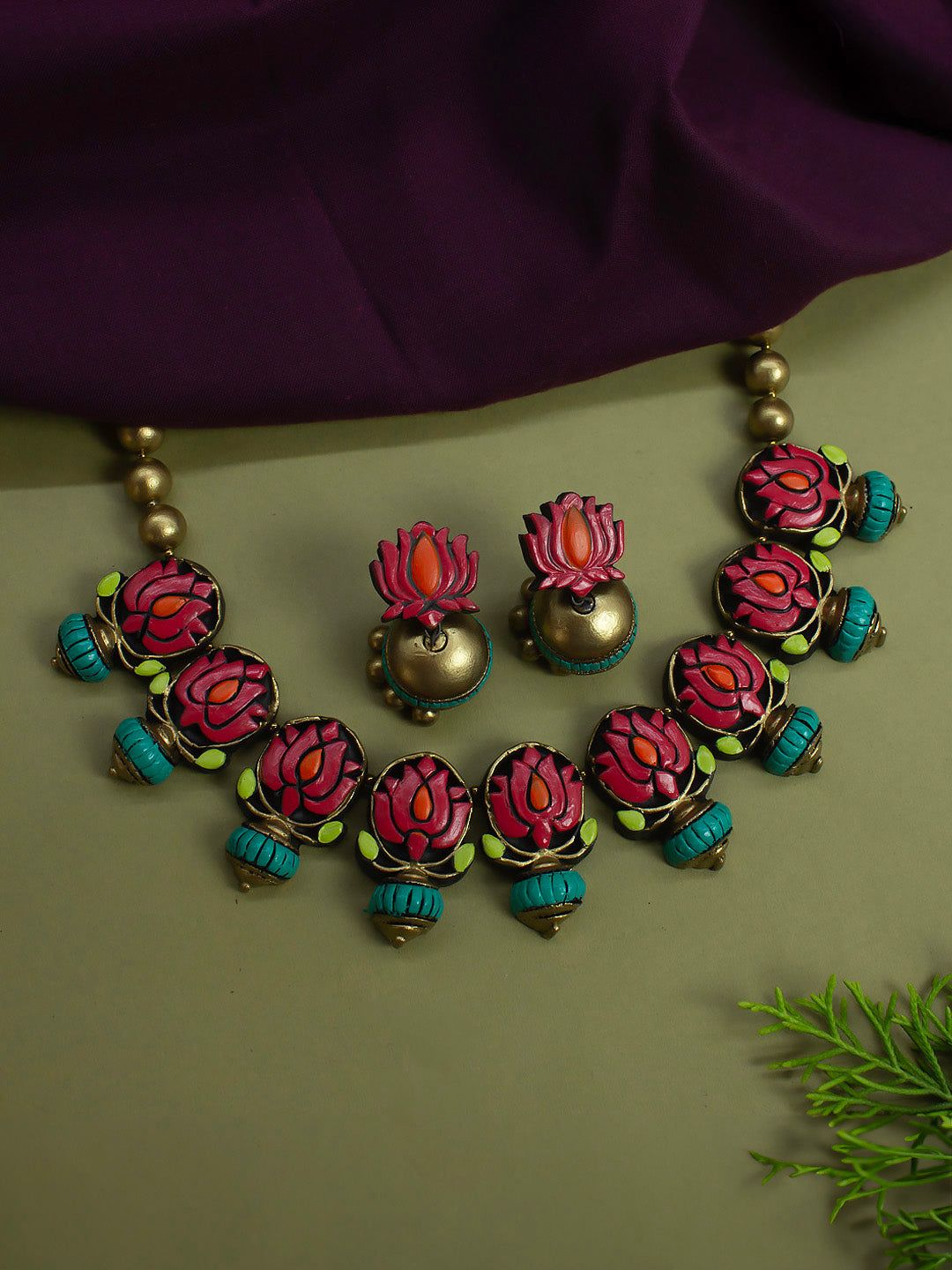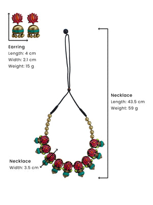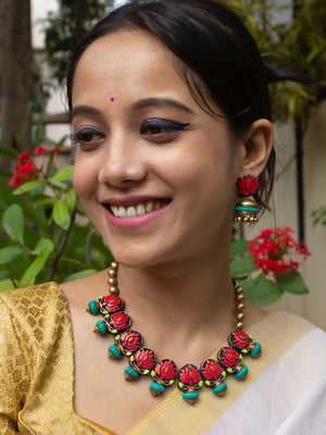 Pastel Colors Pink Green Antique Gold Orange Lotus Design Handmade Terracotta Necklace Set