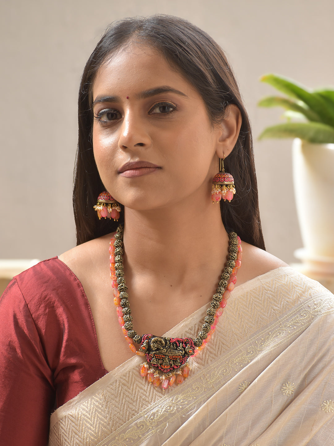 Divine Lord Vishnu Terracotta Necklace Set with Ethnic Beaded Accents – Black & Orange Earrings