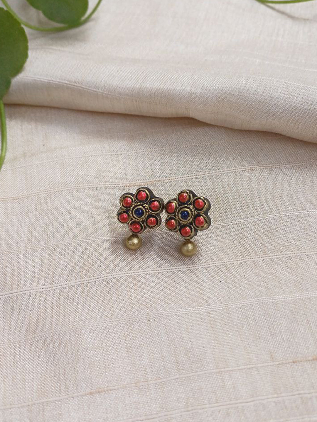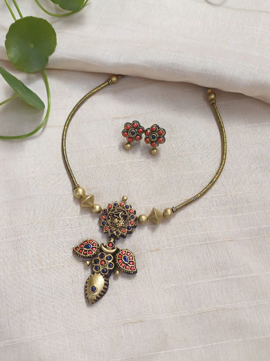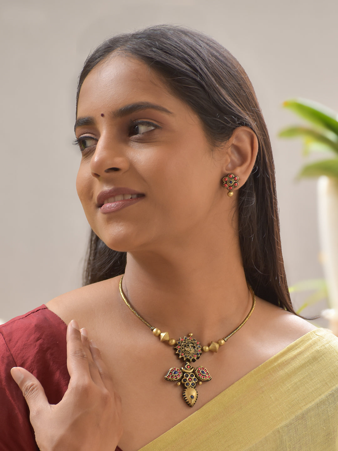 Home Kanakavalli - Floral Medley Antique Gold Terracotta Choker Set With Stud Earrings