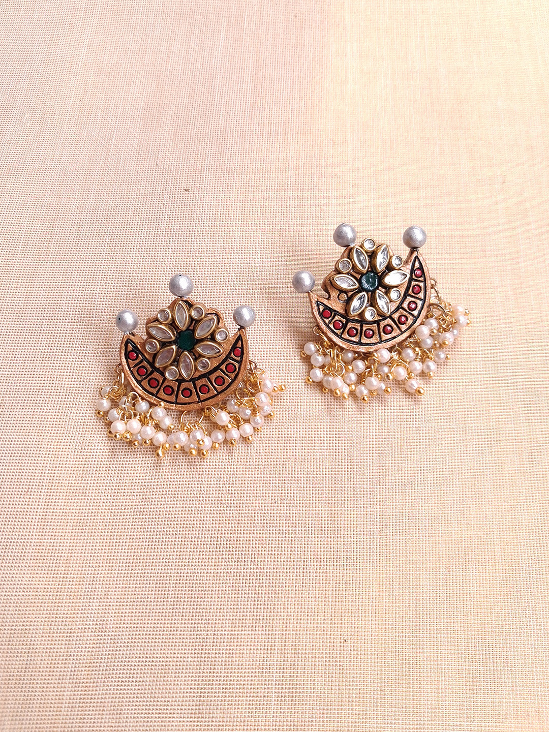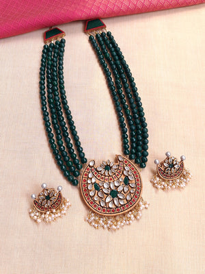 Glass Green Beaded Kundan Necklace with Terracotta Crescent Pendant with Earrings