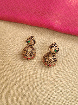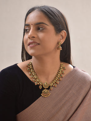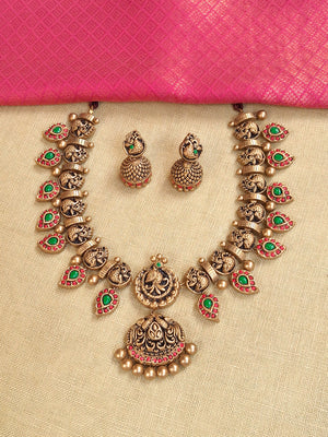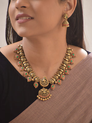 Hamsika – Handmade Terracotta Antique Swan Necklace Set with Red-Green Leaf Motifs and Engraved Jhumka Earrings