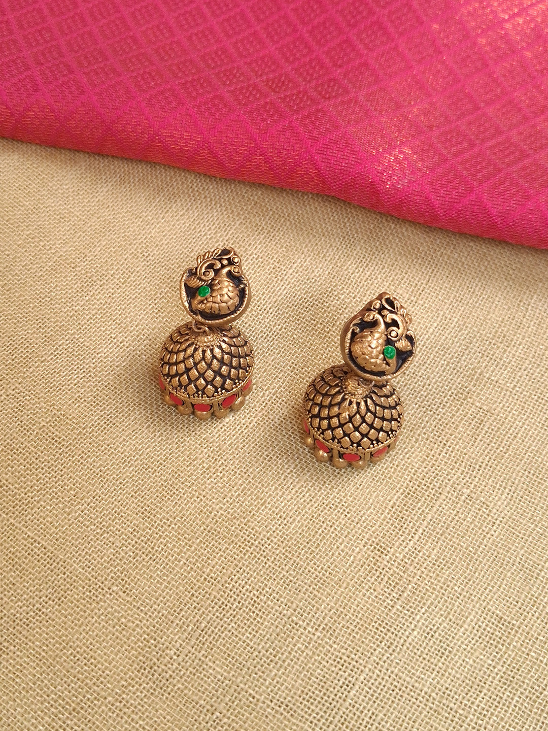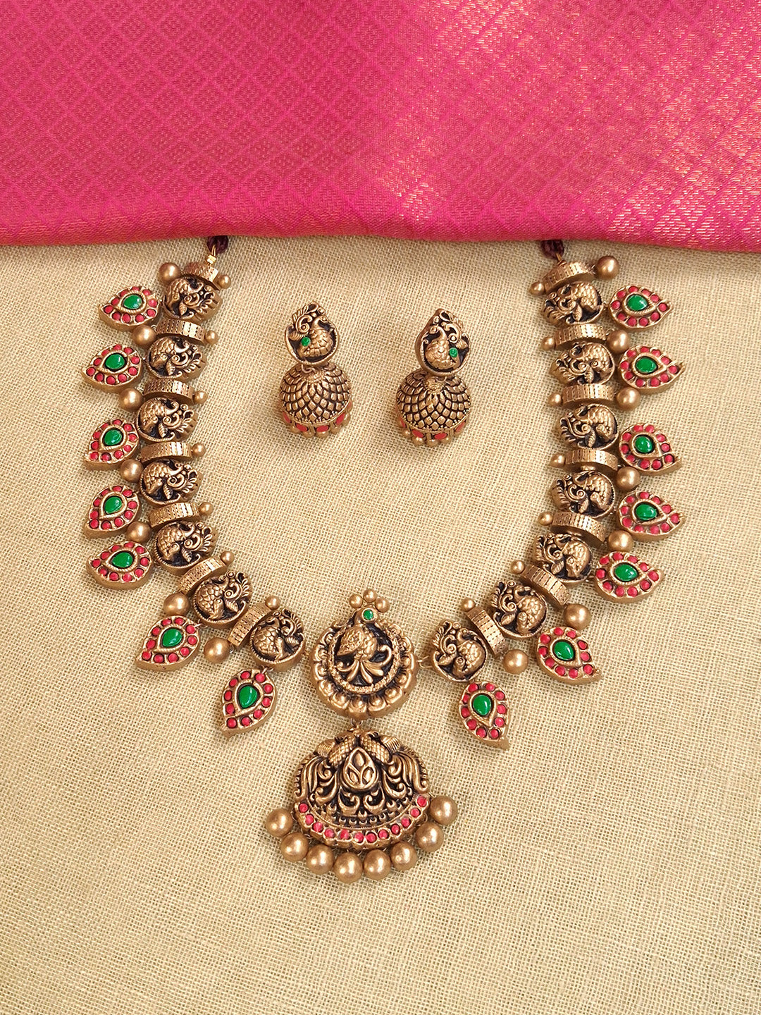 Home Hamsika – Handmade Terracotta Antique Swan Necklace Set with Red-Green Leaf Motifs and Engraved Jhumka Earrings