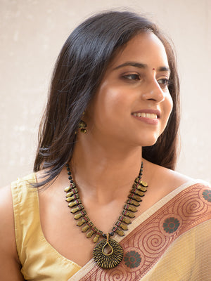 Handcrafted Antique Brass Tribal Necklace Set with Teardrop Pendant and Floral Jhumkas