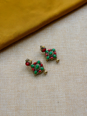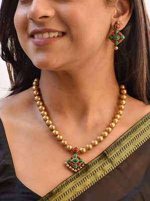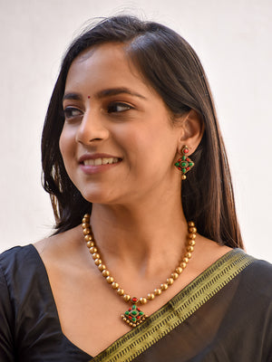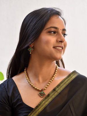 Handcrafted Beaded Terracotta Jewellery Set in Antique Gold, Ruby Red & Emerald Green