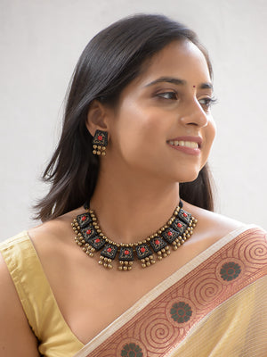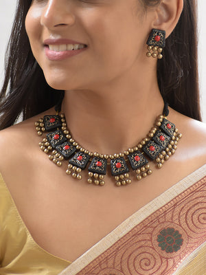 Handcrafted Black Terracotta Necklace Set with Red Accents & Golden Beads