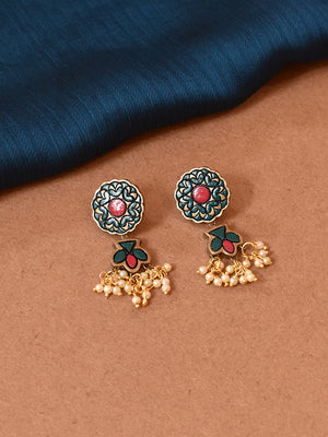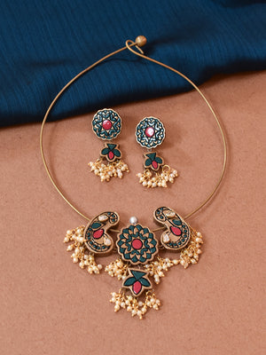 Handcrafted Boho Enamel Choker Necklace Set with Matching Earrings – Tribal Design & Pearl Drops